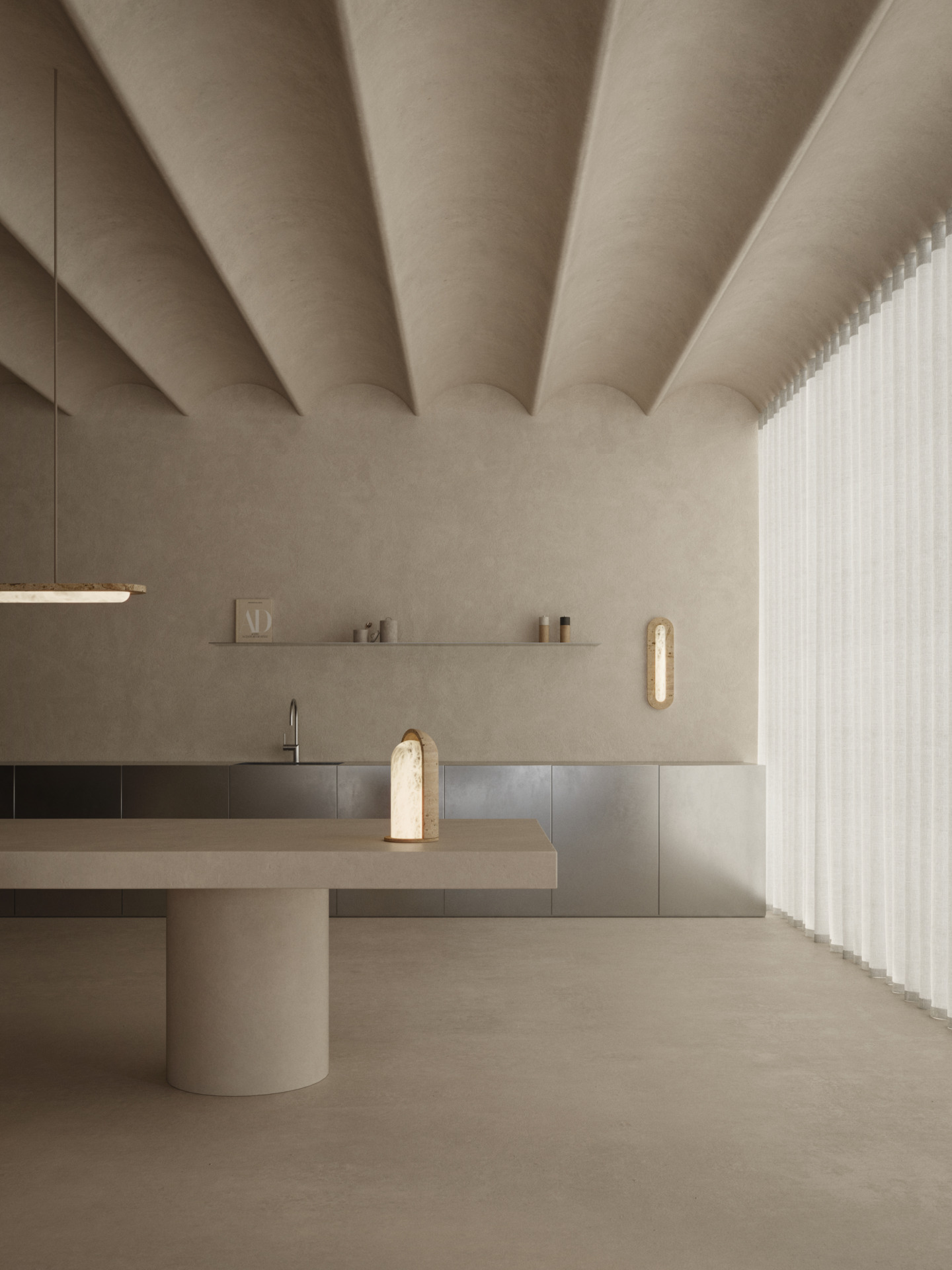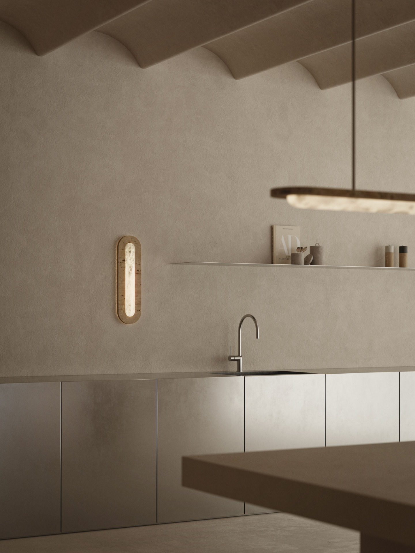 De Capsa collectie transformeert licht tot kunst. De verfijnde kap van natuurlijk albast verspreidt een unieke warmte en hult de ruimte in een serene en verfijnde sfeer. Elke ader en nuance van de steen onthult de organische schoonheid van het materiaal, waardoor iedere lamp een uniek object is.