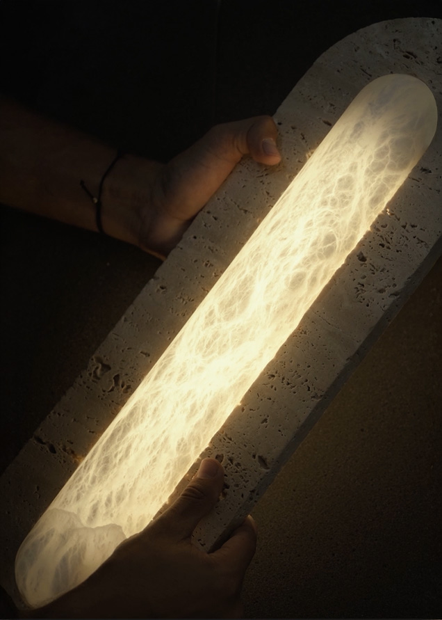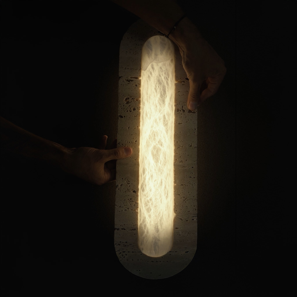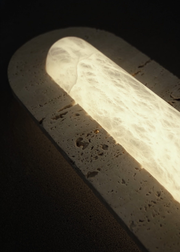 Het licht dat door het albast filtert, creëert een subtiel spel van transparantie en schaduw dat uitnodigt tot verstilling en een gevoel van balans en welzijn oproept.