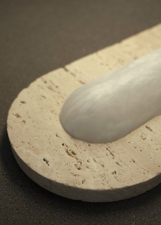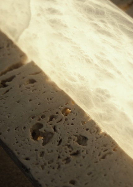De personaliseerbare marmeren voet, verkrijgbaar in wit Travertin en zwart Marquina, geeft het ontwerp stevigheid en karakter. Zij vormt een krachtig tegenwicht voor de visuele lichtheid van het albast. Deze combinatie resulteert in een tijdloos object waarin design, materiaal en licht in perfecte harmonie samenkomen en waarin functionaliteit overgaat in een ware lichtsculptuur.