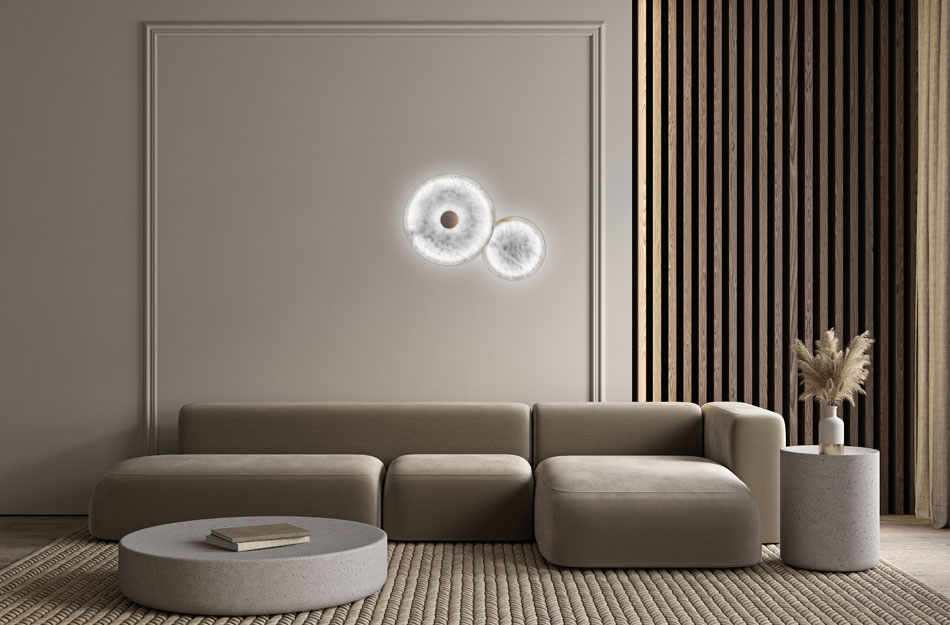 De LED-lichtbron, subtiel geplaatst achter de schijven, verspreidt een zachte en diffuse gloed die door de steen heen schijnt, waardoor het armatuur lijkt te zweven tegen de wand. Het resultaat is warme, rustgevende verlichting die elke ruimte met subtiliteit en elegantie transformeert.