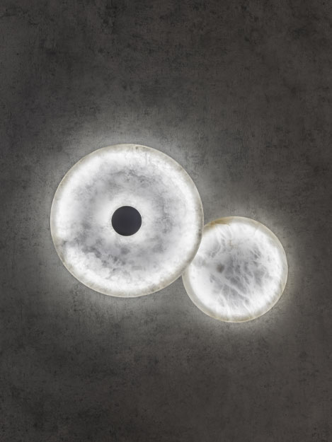 De Nuvol WS lamp bestaat uit twee overlappende schijven van albast die, in interactie met licht, een translucente en omhullende werking creëren. Geïnspireerd op organische vormen uit de natuur en wolken, roept het ontwerp een gevoel van lichtheid en beweging op.