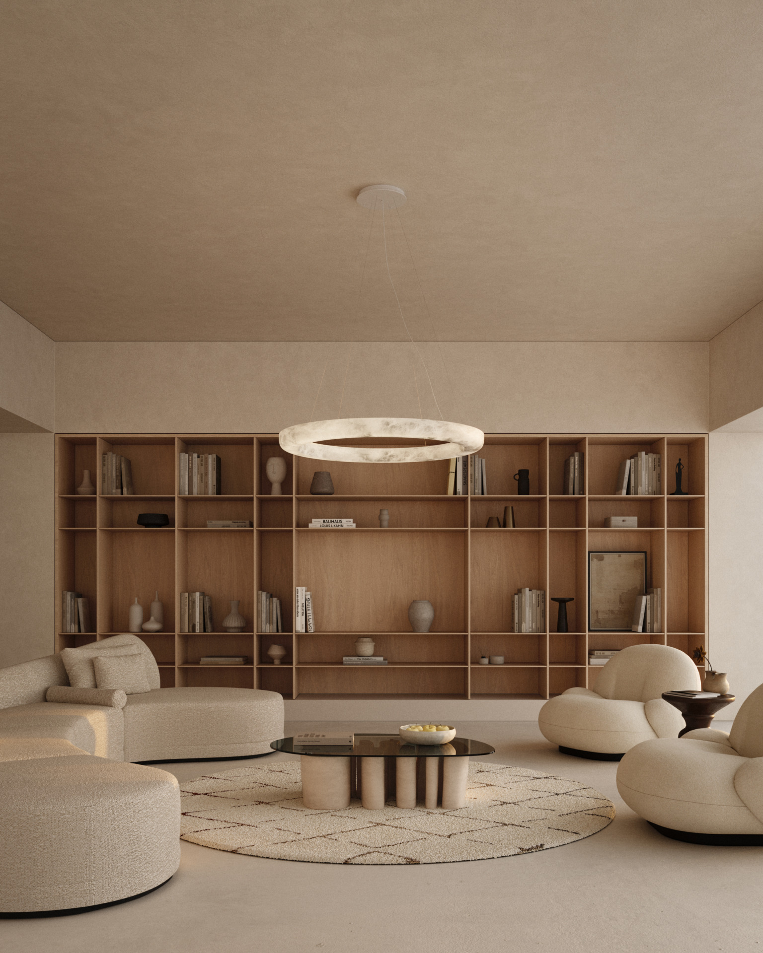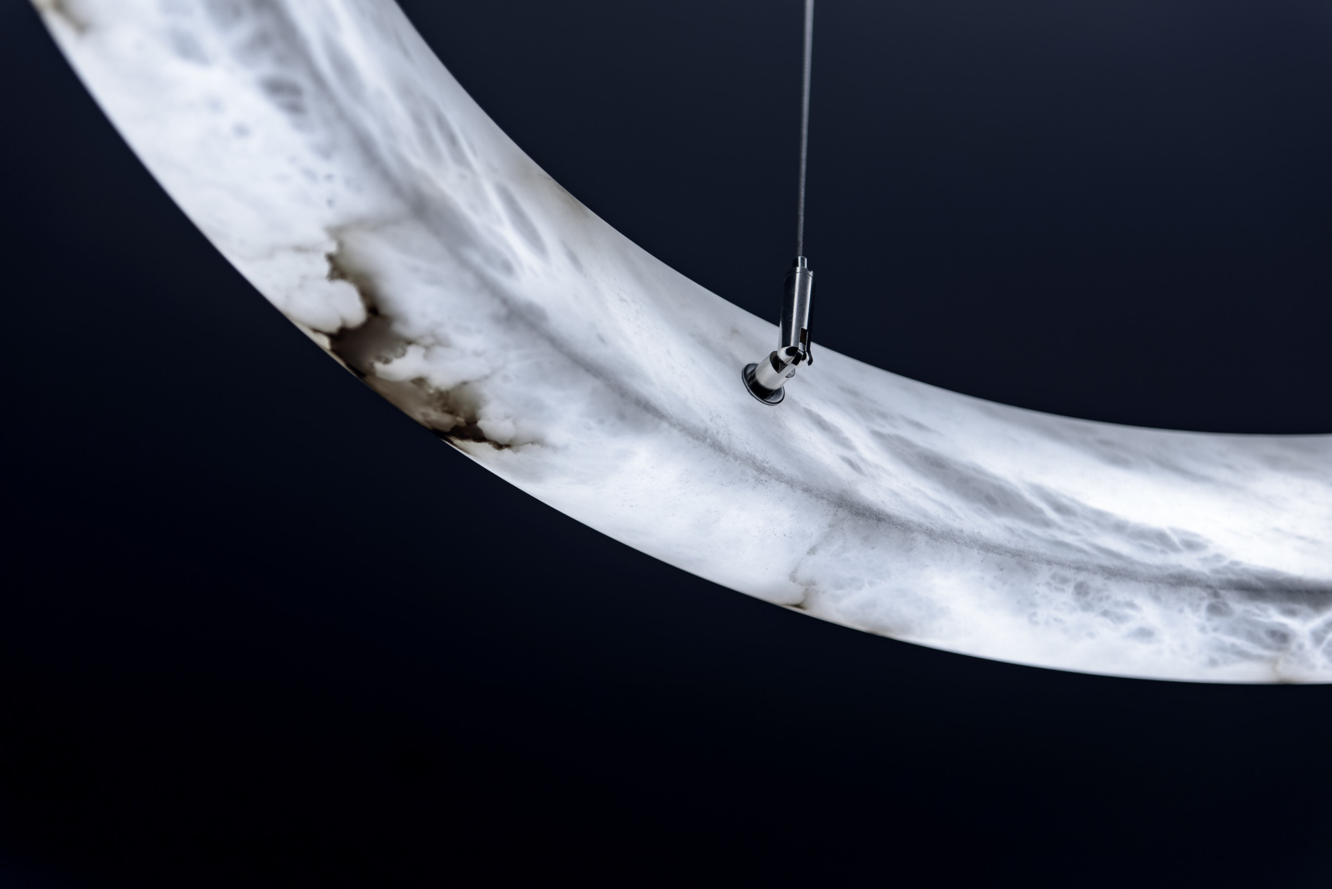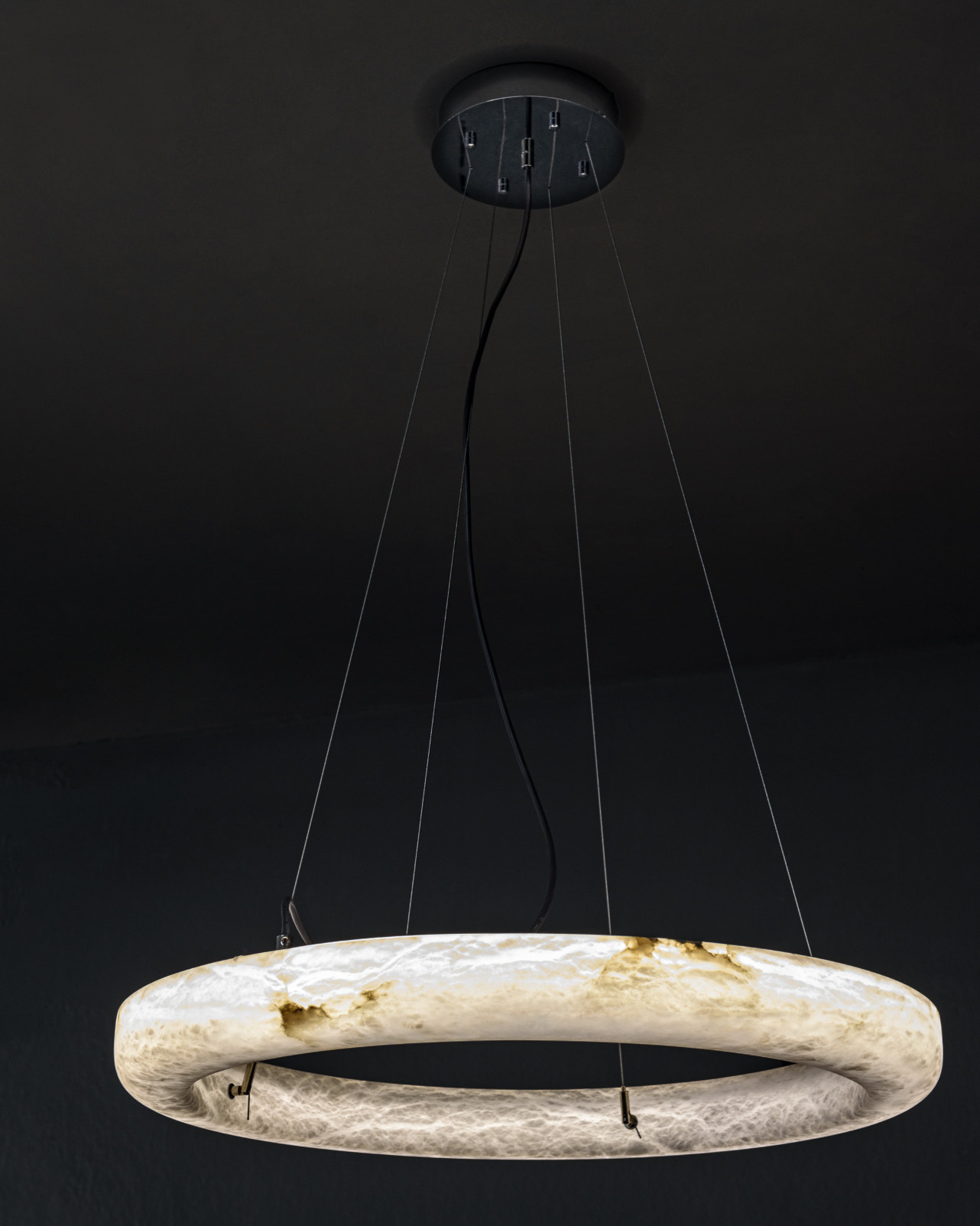 Ring is een hanglamp die bestaat uit een volledig verlichte ring van natuurlijk albast, opgehangen aan een minimalistische en elegante constructie. Elk exemplaar benadrukt de unieke tekening van het albast en zorgt voor een warme en verfijnde lichtbeleving.