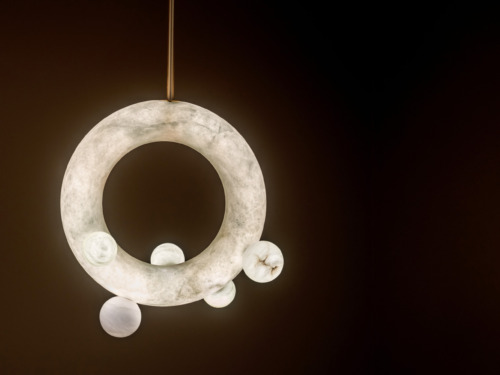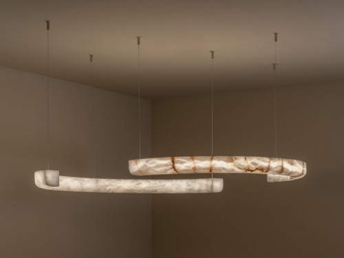 Het resultaat is een cilindrisch armatuur met een geribbelde sectie, die dynamiek toevoegt aan de kap en het licht gelijkmatig verspreidt via het albast. Over de volledige lengte van de kap is aan de onderzijde een opening geïntegreerd.