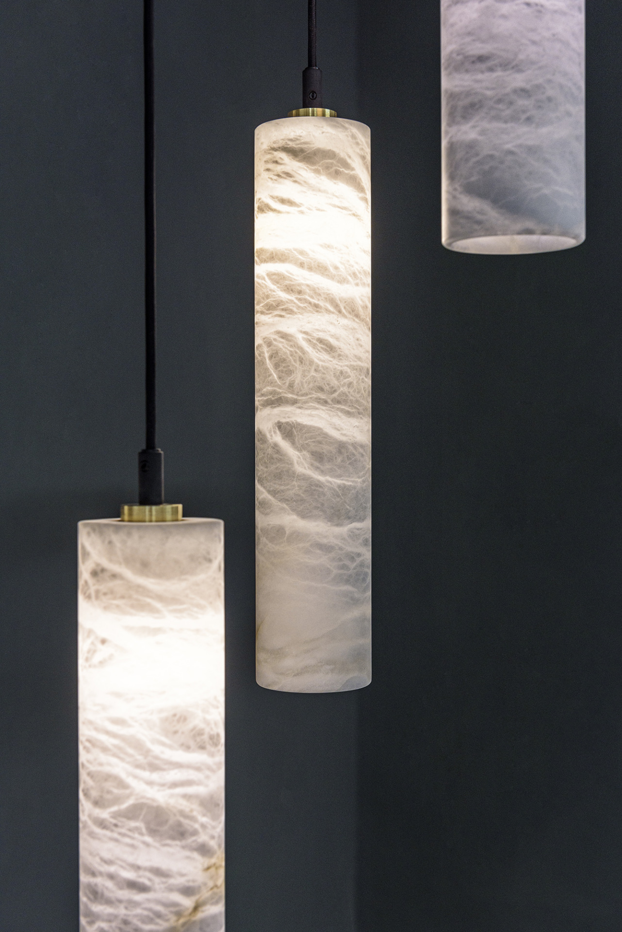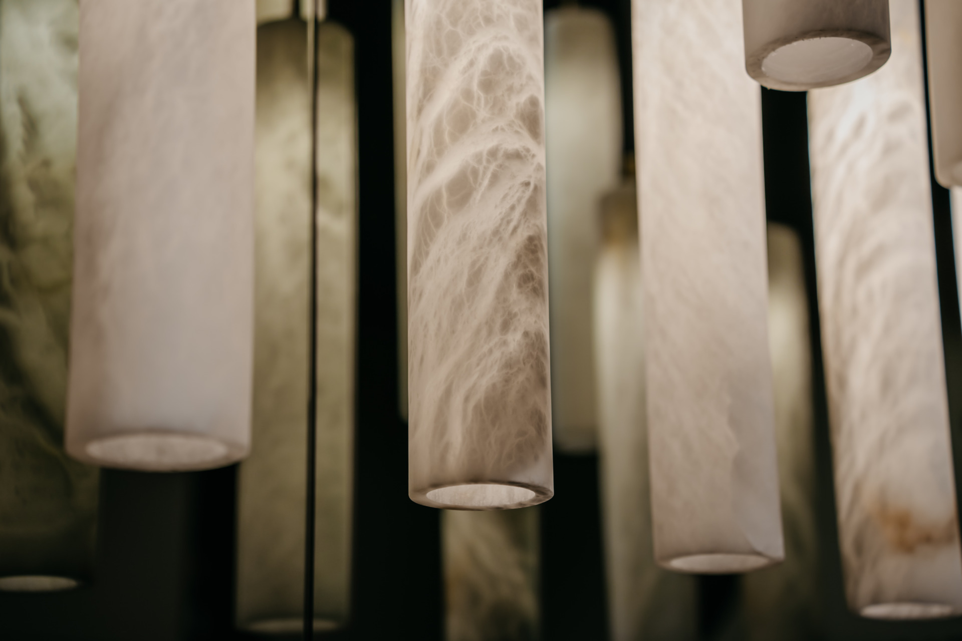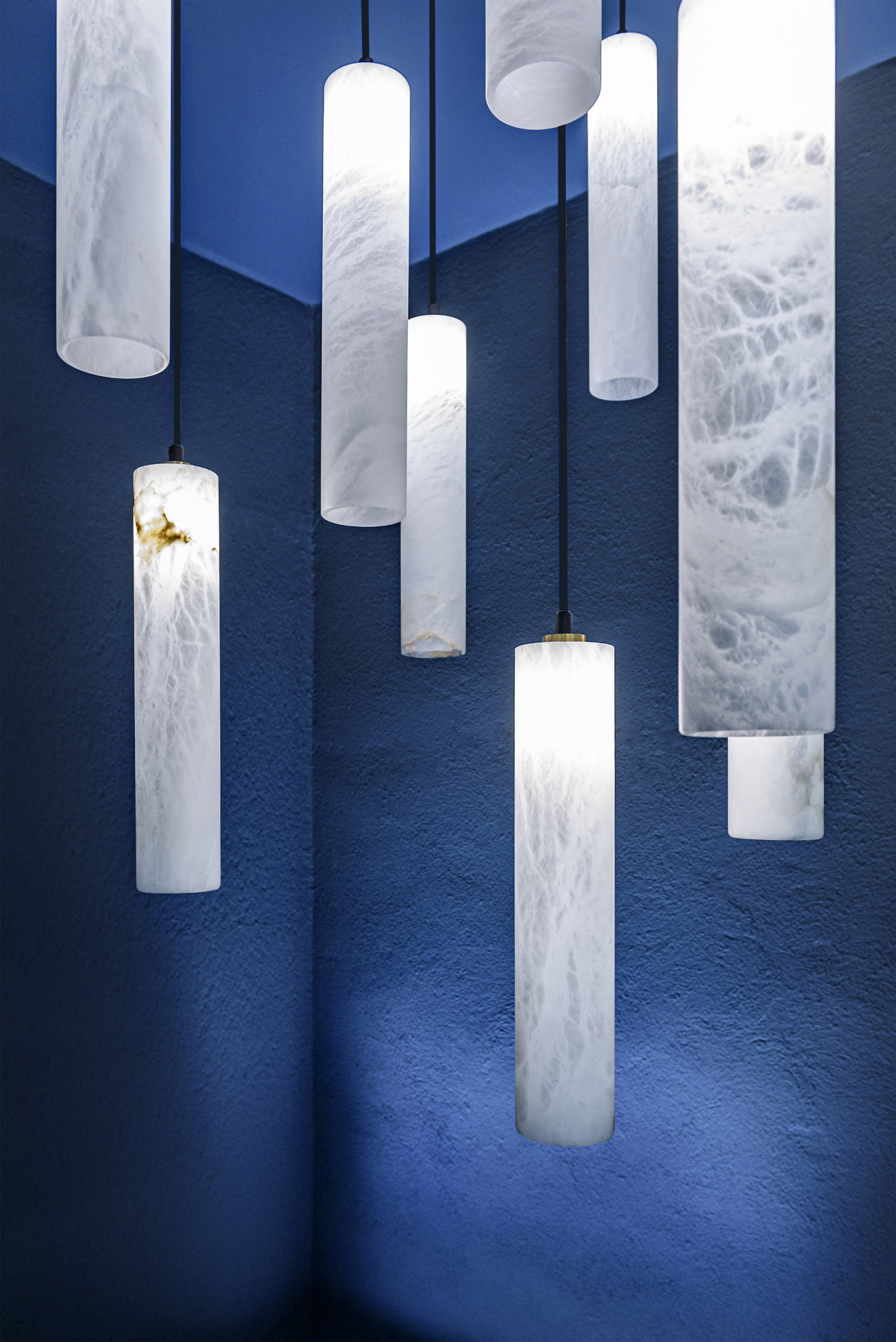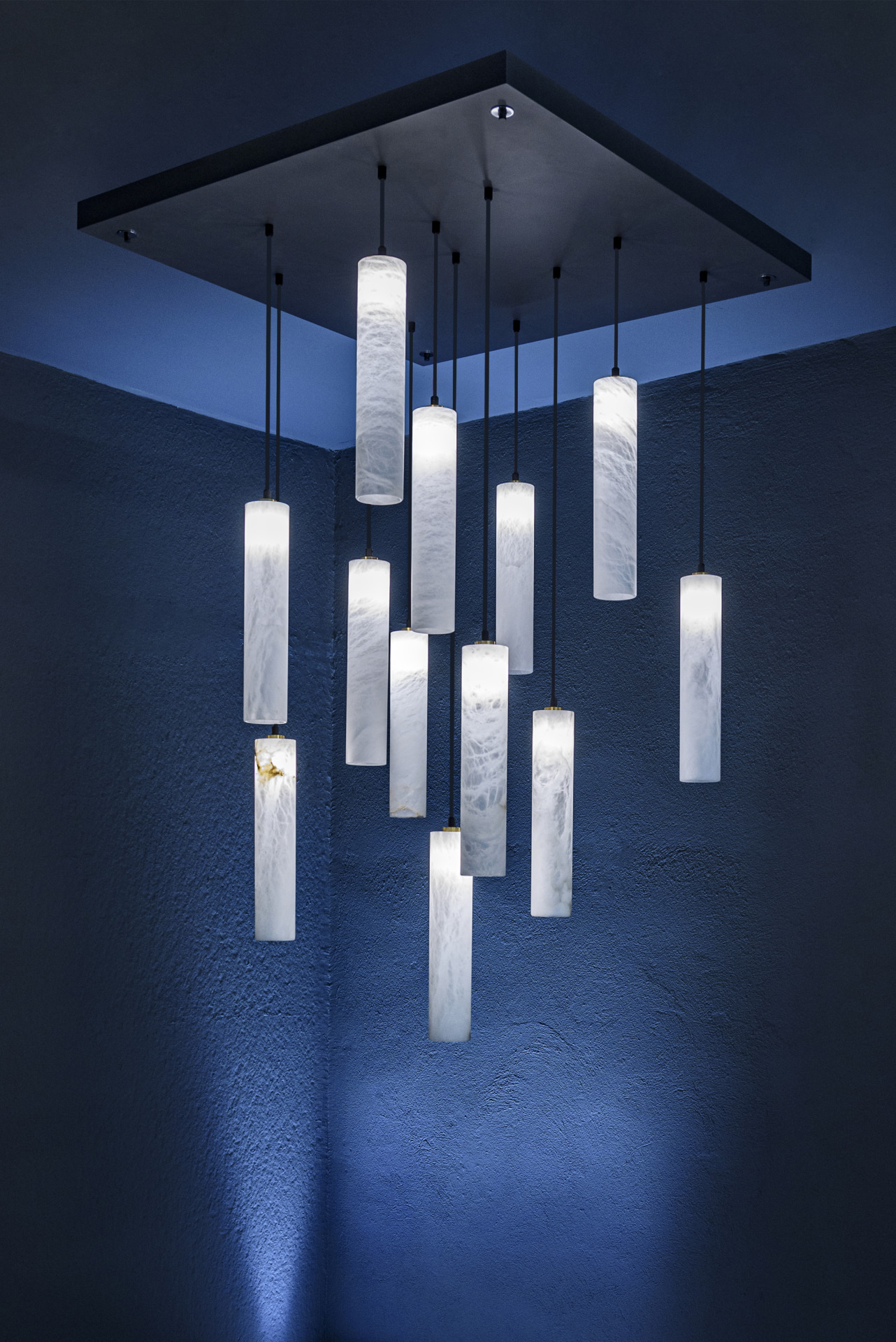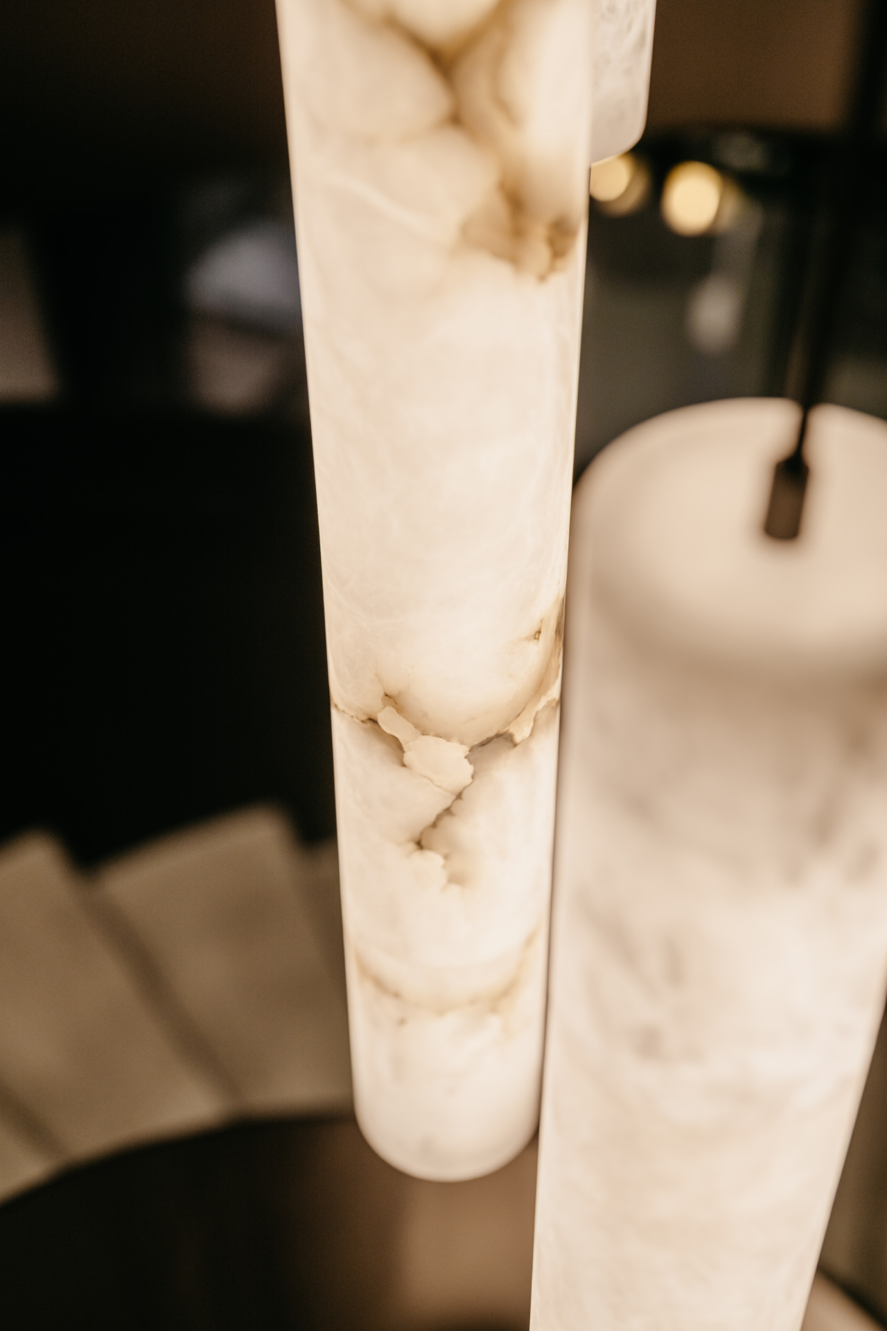 Een compositie van albasten cilinders, op verschillende hoogtes gesuspendeerd. Een uitgesproken en visueel krachtig ontwerp dat perfect tot zijn recht komt in hotellobby’s of in centrale trappenhuizen, ongeacht de gekozen interieurstijl.