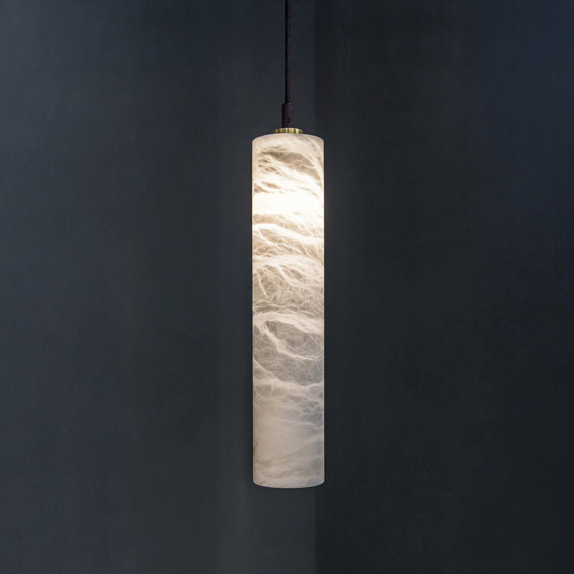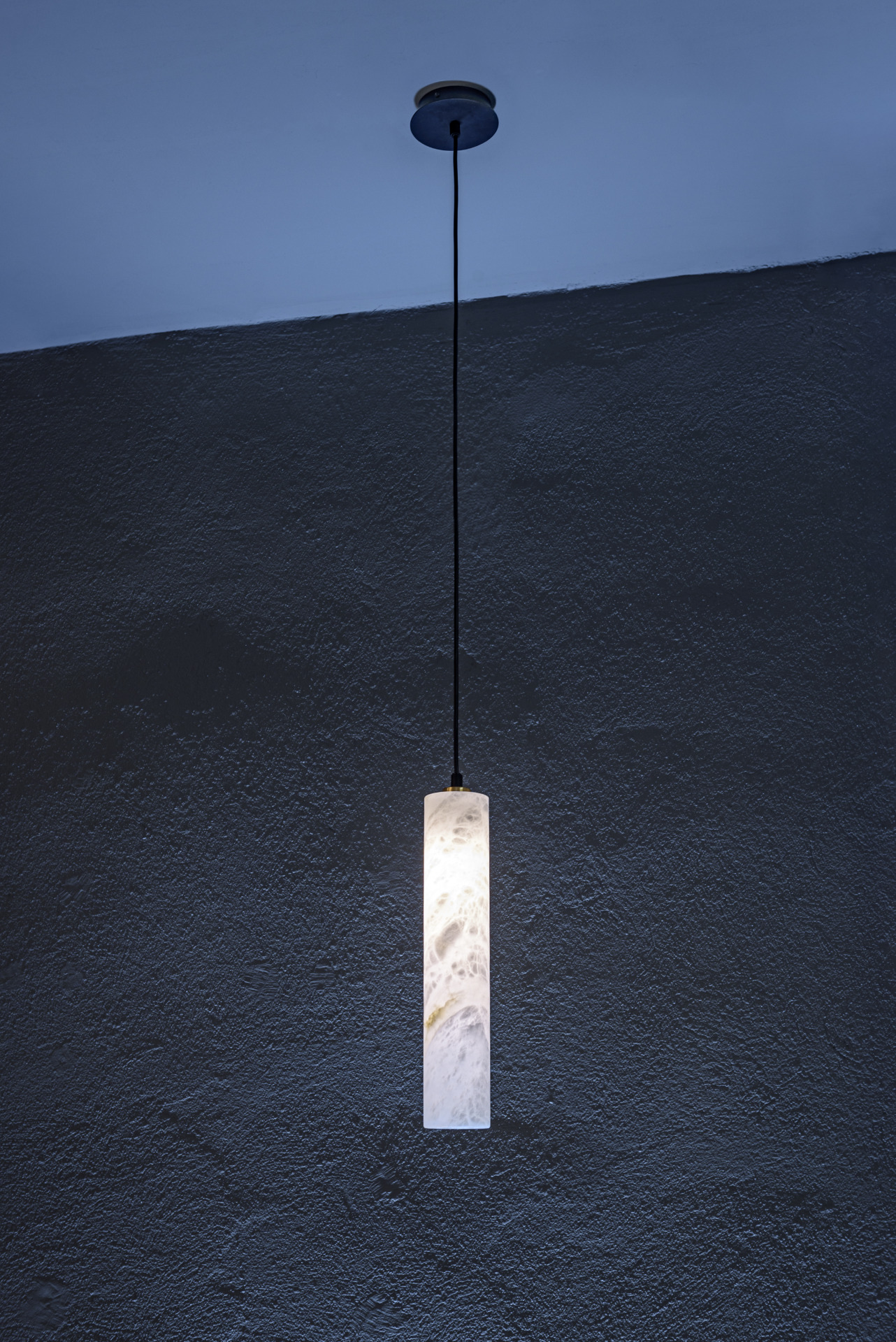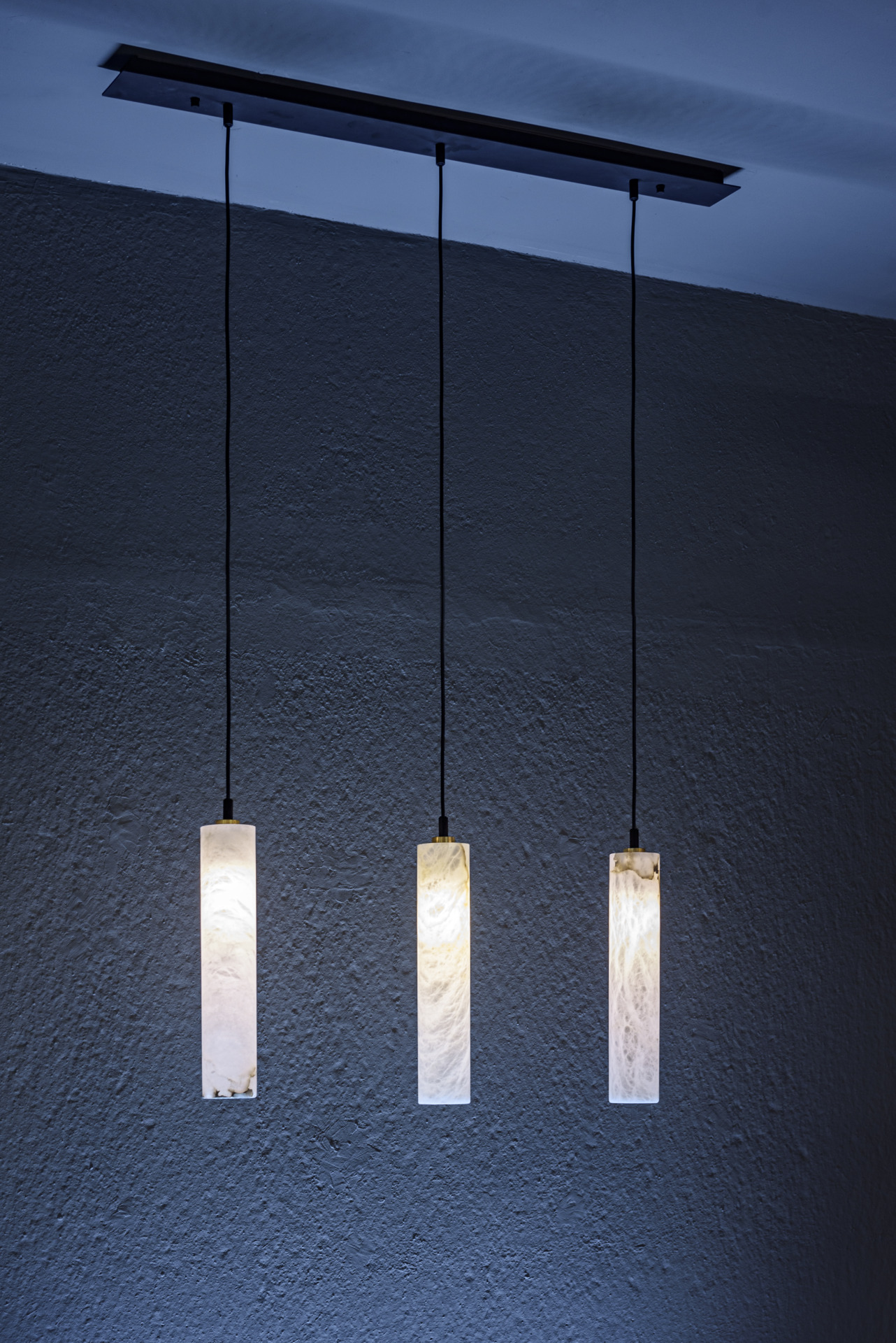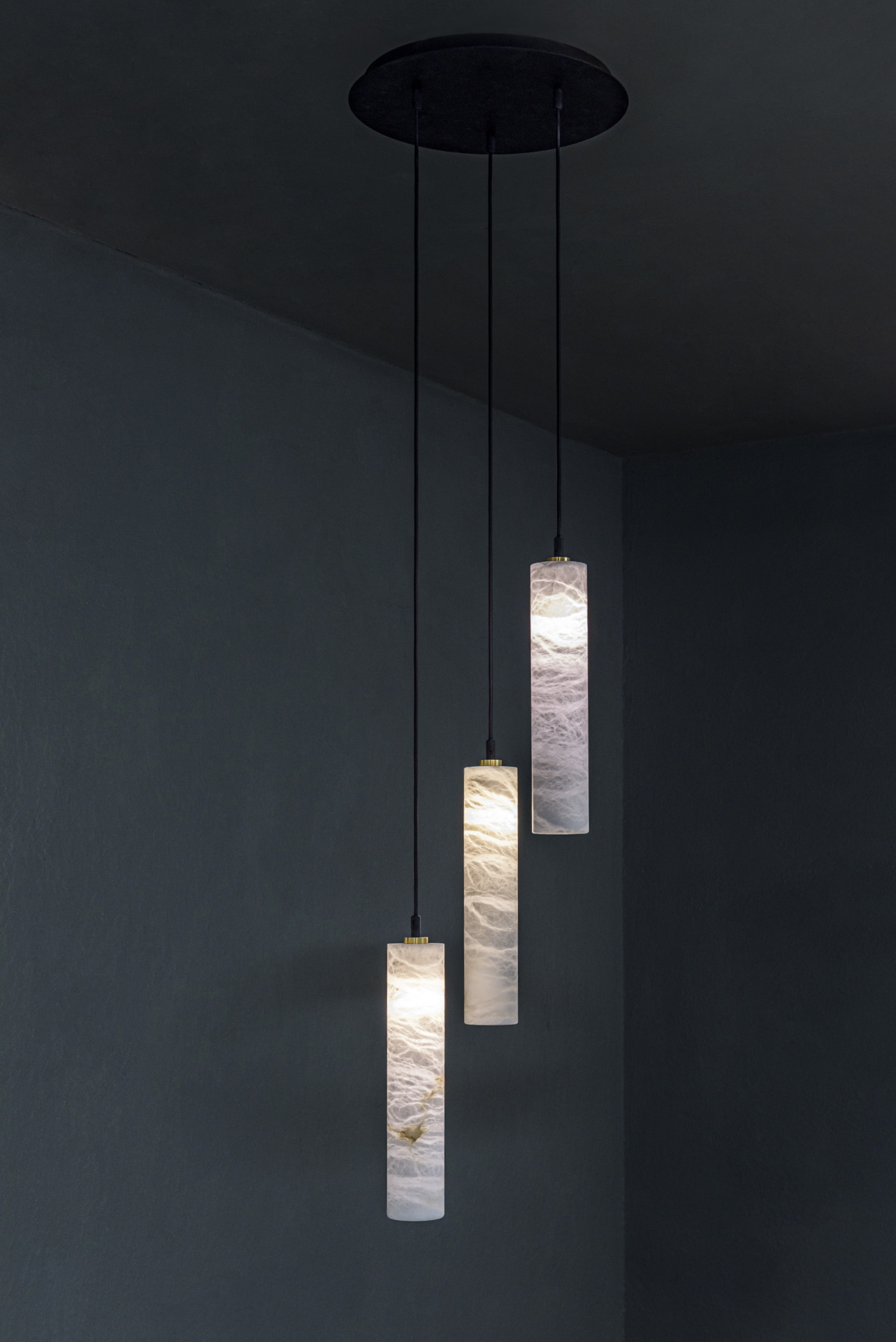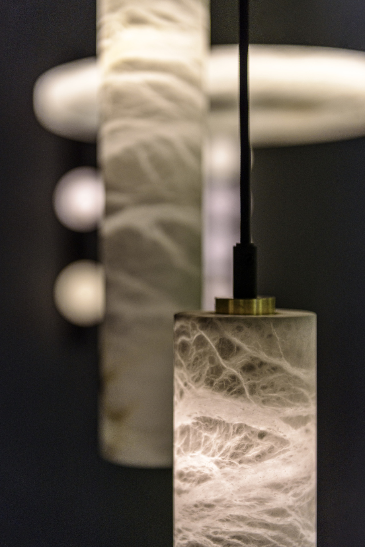 Een compositie van albasten cilinders, op verschillende hoogtes gesuspendeerd. Een uitgesproken en visueel krachtig ontwerp dat perfect tot zijn recht komt in hotellobby’s of in centrale trappenhuizen, ongeacht de gekozen interieurstijl.