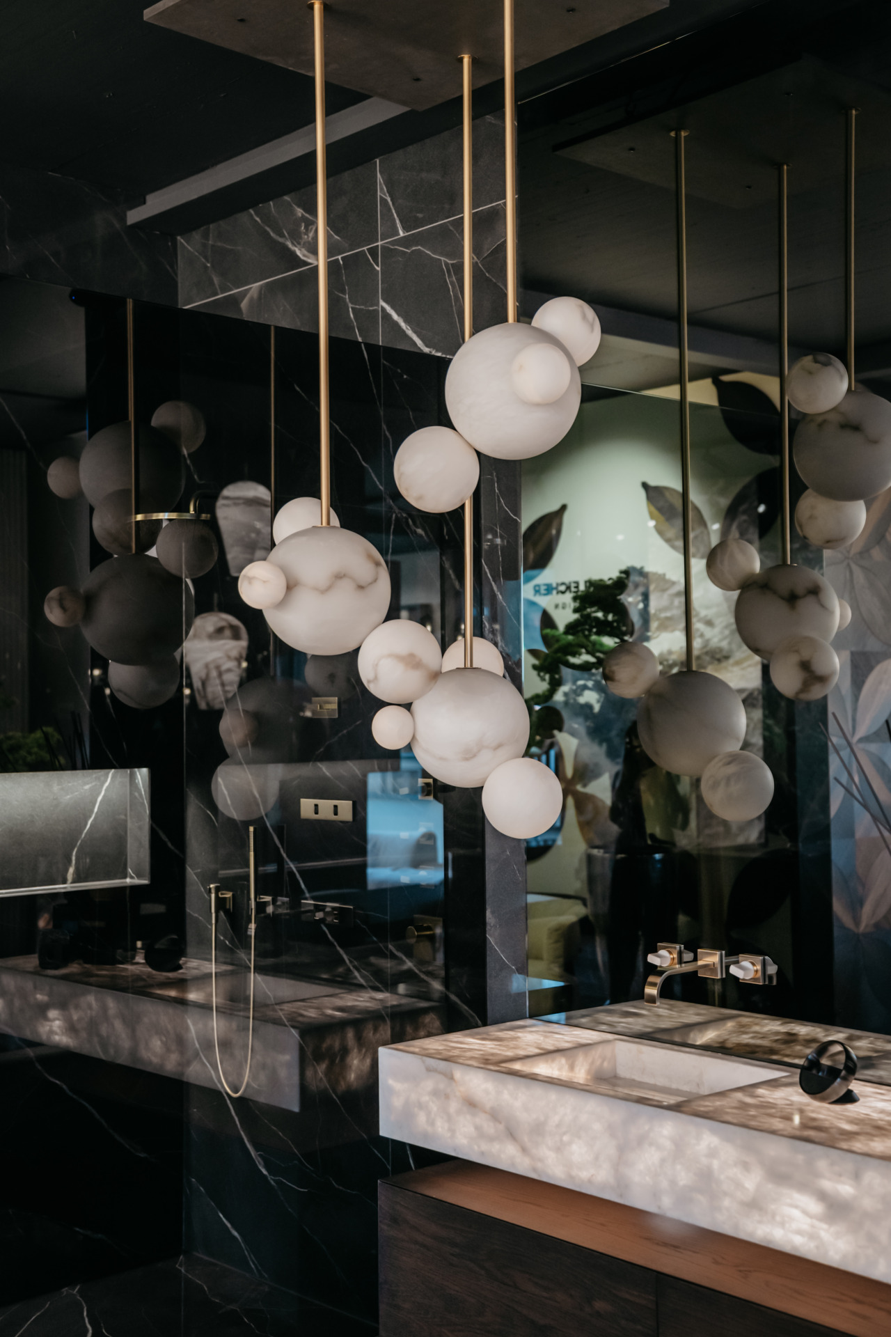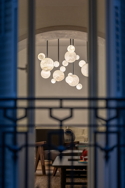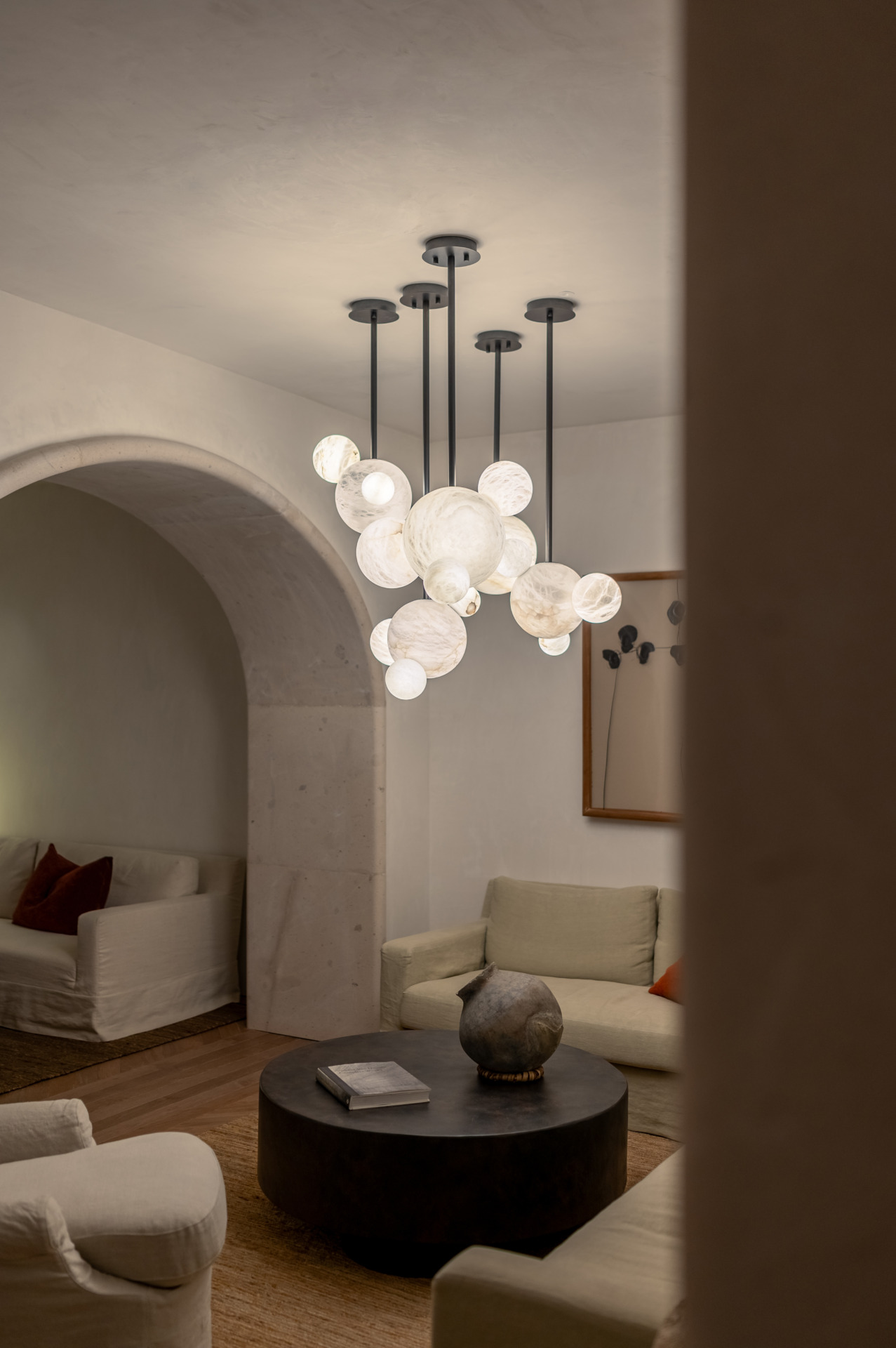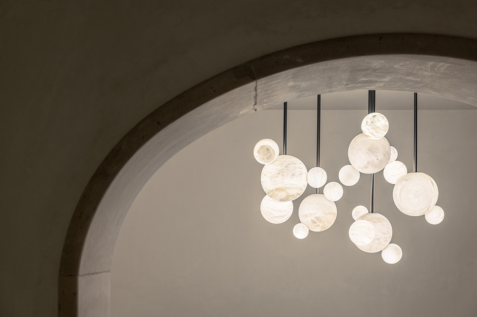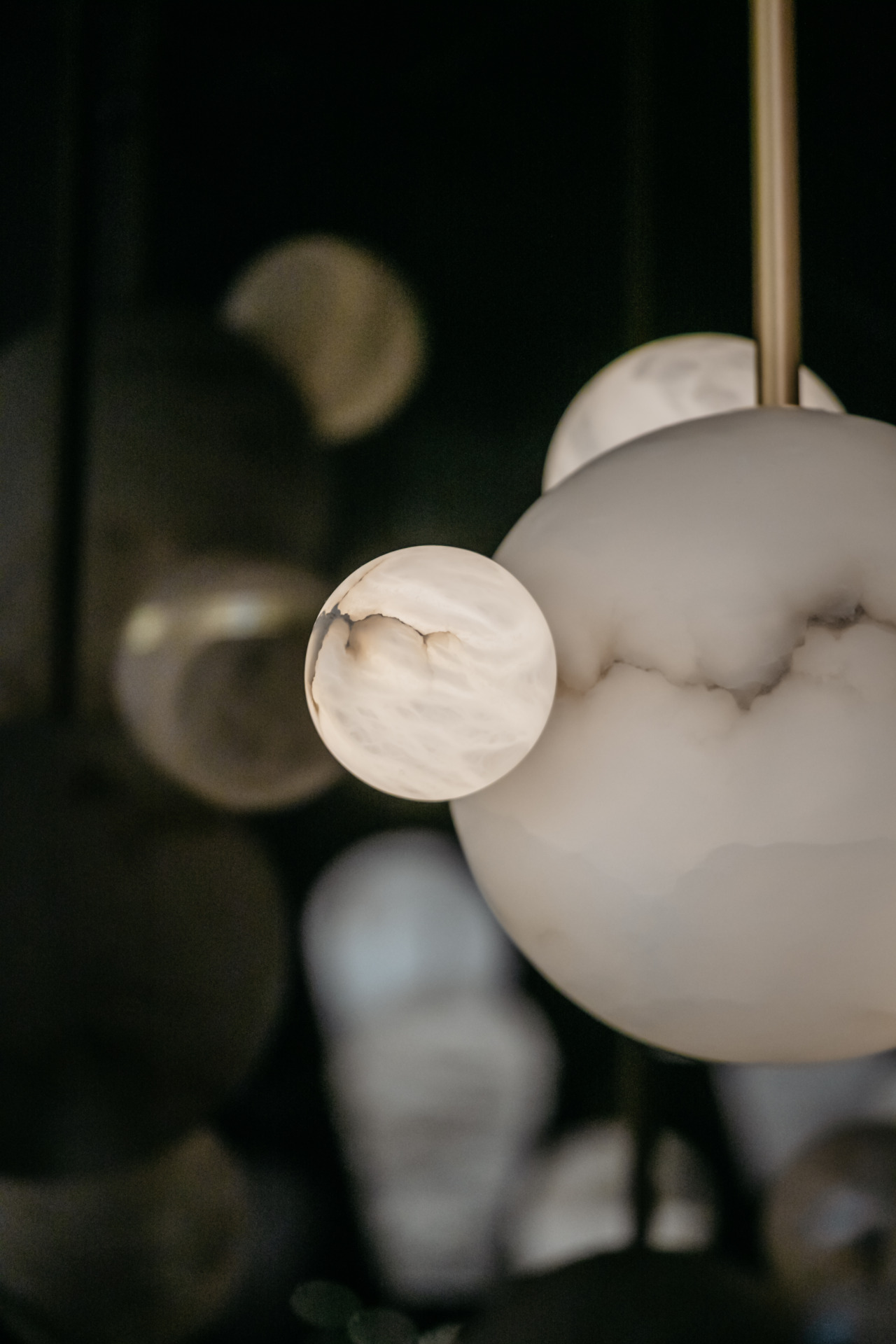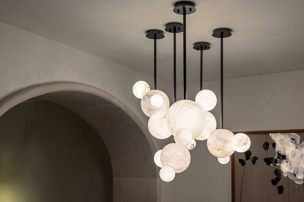 De Up & Down lamp is een designobject dat de verbinding tussen aarde en lucht verbeeldt. Het armatuur bestaat uit vier bollen van natuurlijk albast op een verticale metalen structuur en combineert de massiviteit van steen met de lichtheid van metaal.